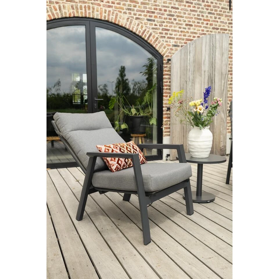De rugleuning van de Azoren loungestoel is verstelbaar middels de knop aan de binnenkant van de armleuning. Hierdoor zit de knop niet in het zicht waardoor het niet storend is. Het onderstel van de stoel is gemaakt van aluminium. Het aluminium is voorzien van een antraciet kleurige coating die kras- en stootvast is. Het antraciet kleurige frame combineert perfect bij de grijze kussens en zorgt dan ook voor een stijlvolle uitstraling. Tussen dit frame is een textileen doek gespannen. In dit doek zit iets rek wat ervoor zorgt dat de stoel een fantastisch zitcomfort heeft. Let op dat je de kussens na gebruik op een droge en geventileerde plek opbergt, ze zijn namelijk niet waterbestendig. Uiteraard kunnen ze echt wel een keer tegen een buitje regen maar zijn ze hier niet speciaal voor gemaakt.