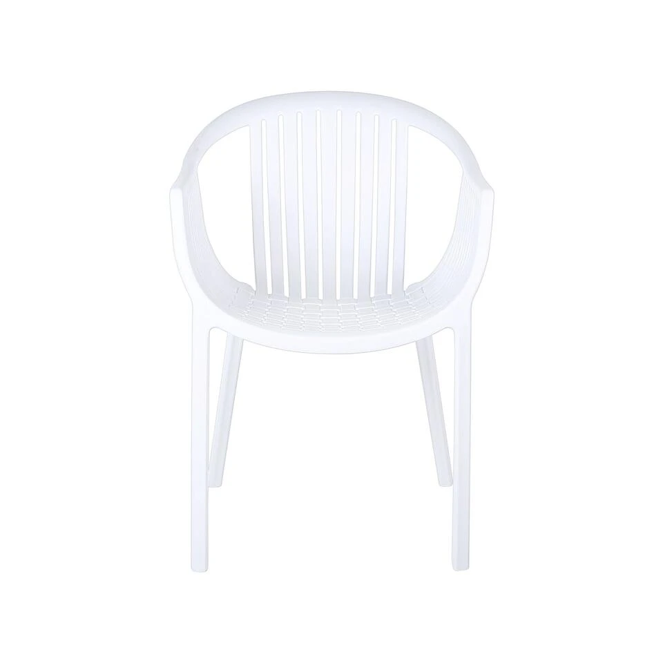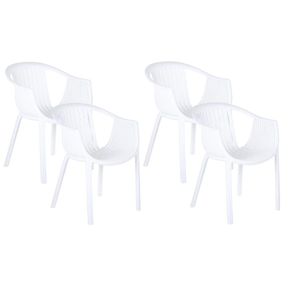 Set van 4 stapelbare kuipstoelen voor buiten. Deze set tuinstoelen komt van pas in elke binnen- of buitenomgeving. De stoelen zijn volledig gemaakt van UV- en waterafstotende, duurzame kunststof. Ze zijn onderhoudsarm en bijzonder gemakkelijk schoon te maken. De stoelen hebben een modern design dankzij het geweven patroon en gebogen armleuningen. De tijdloze witte kleur maakt ze universeel qua stijl, terwijl de brede zitting optimaal zitcomfort biedt. De stoelen zijn voorzien van pootdoppen voor extra oppervlaktebescherming en zijn gemakkelijk op te bergen dankzij de stapelfunctie.