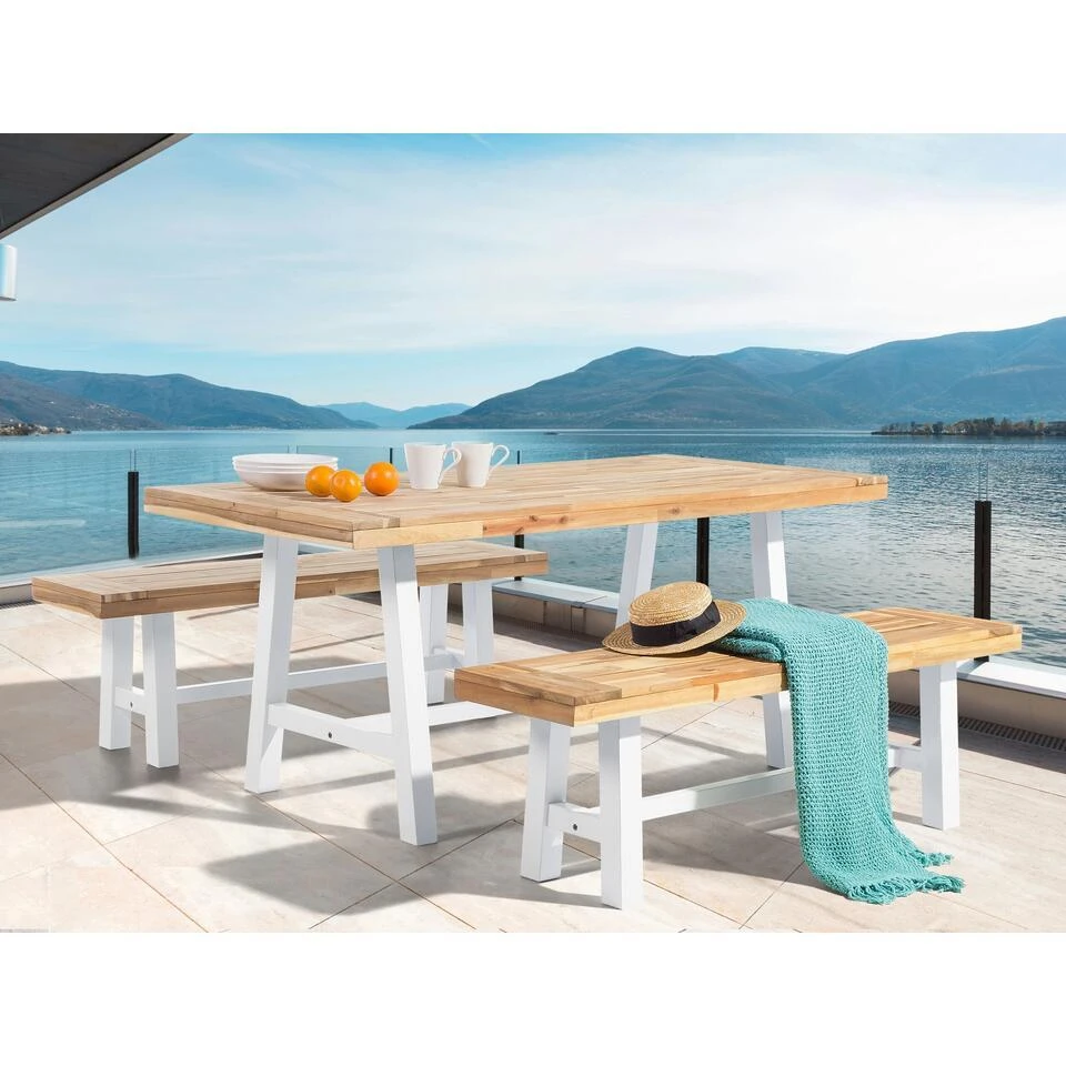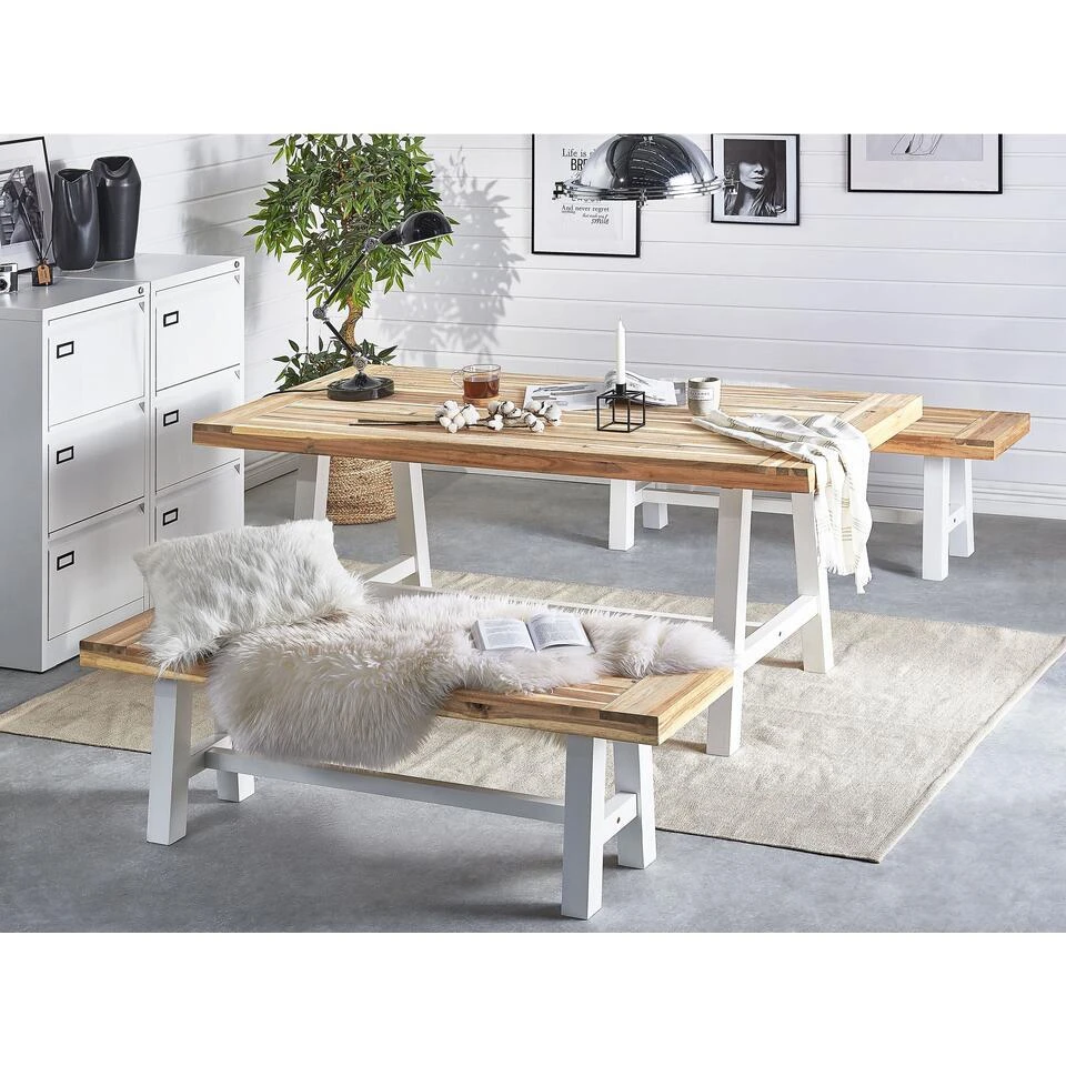 Mooie tafel gemaakt van acaciahout. De klassieke houten bank is opnieuw ontworpen om het geheel modern en functioneel te maken. De prachtige tafel toont zijn natuurlijke uitstraling in een minimalistische en eigentijdse omgeving.Het is met olie afgewerkt voor een lange levensduur.