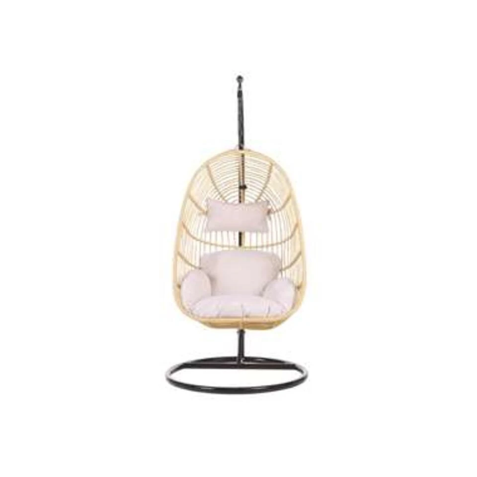 Moderne hangstoel in beige met zwart frame inclusief kussens. Een stabiel stalen frame gecombineerd met een prachtige gevlochten mand in een kleur die in elk interieur past en een feel-good karakter aan de ruimte geeft. Dankzij het sterke ketting-ophangsysteem kun je heerlijk heen en weer schommelen. De charmante boho-look van dit model en de zachte, waterbestendige kussens zorgen voor een onbezorgd gevoel, zodat het verblijf op de veranda, het balkon of in de slaapkamer een heerlijk avontuur wordt.