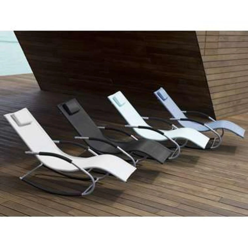 Exclusieve, blauwe ligbed om in te schommelen. Dit ligbed onderscheidt zich door zijn eigentijdse, dynamische ontwerp en zal een blikvanger zijn in elke tuin, balkon of terras. Het is gebouwd met stalen geleiders en uitgerust met antisliphoezen voor een soepele en ontspannende schommelbeweging. De ergonomisch gevormde zitting is gemaakt van stof en heeft een gecapitonneerde hoofdsteun voor extra comfort.