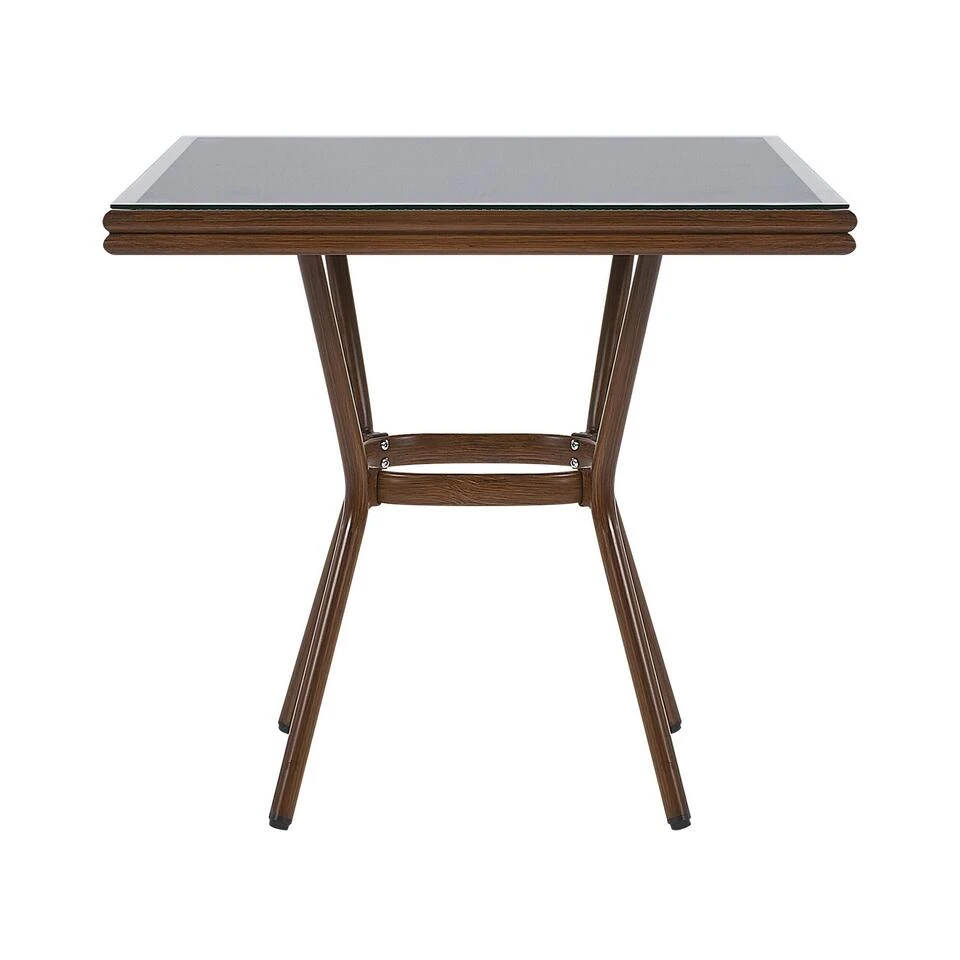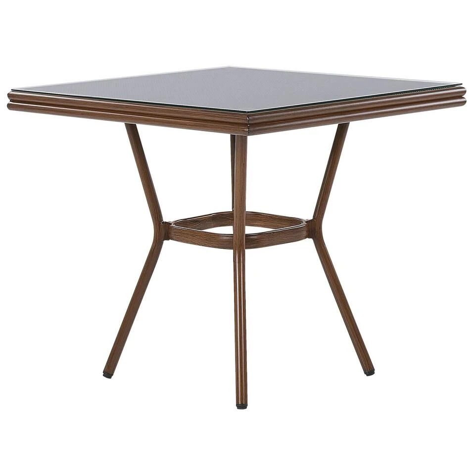 Zwarte terrastafel met gehard glas in trendy look. De stijlvolle tafel van aluminium in een bamboe-achtige afwerking zal elke buitenruimte visueel benadrukken, of het nu een tuin of een balkon is. Het ziet er geweldig uit in combinatie met houten, rotan en metalen elementen. Een stabiel metalen frame in een donkere houttint harmonieert perfect met het blad van gehard glas. De vierkante tafel past zelfs op een kleiner terras of terras.