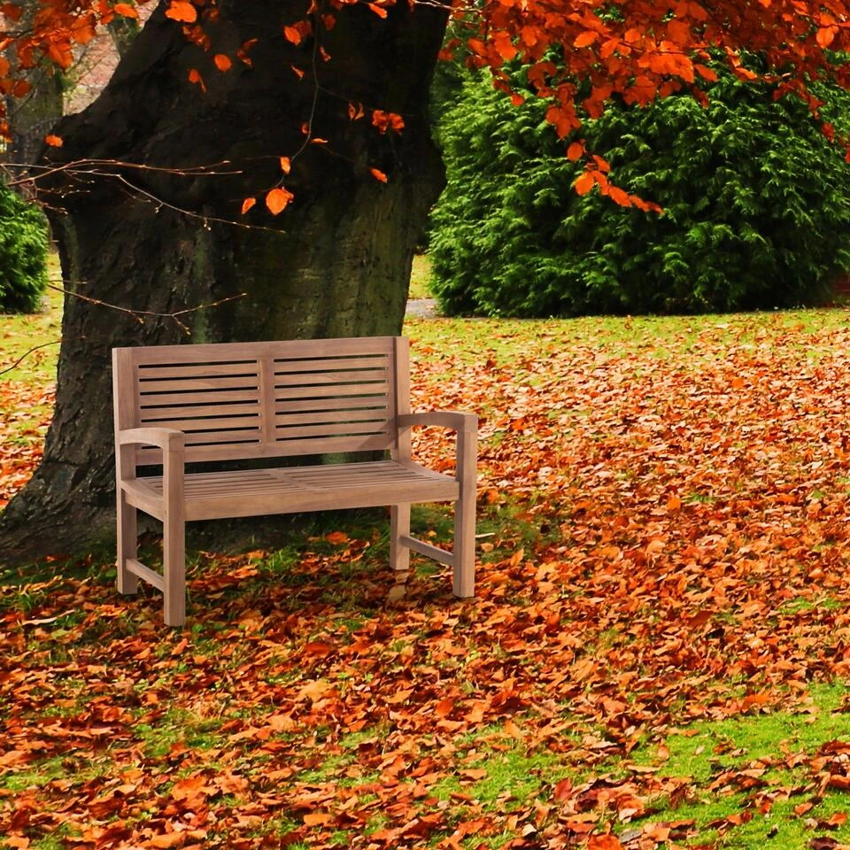 Met deze solide bank van massief teakhout kunt u heerlijk ontspannen en genieten van de natuur. Het uiterst hoogwaardige en duurzame materiaal is ontworpen voor comfortabel zitten. Mooie details zijn het tijdloze ontwerp van de spijlen, de licht gebogen zitting en de aangenaam schuin geplaatste rugleuning. De comfortabele armleuningen ronden het totaalplaatje af. De stabiele poten zijn gemaakt van 6×6 cm dik massief hout. Teakhouten tuinmeubelen kunnen het hele jaar door buiten blijven staan. Voor het behoud van de kleur worden geschikte onderhoudsolie voor teak aanbevolen, die u desgewenst bij de vakhandel kunt verkrijgen.