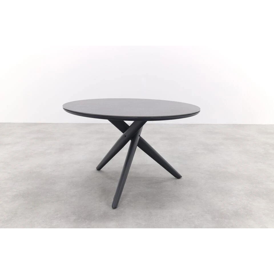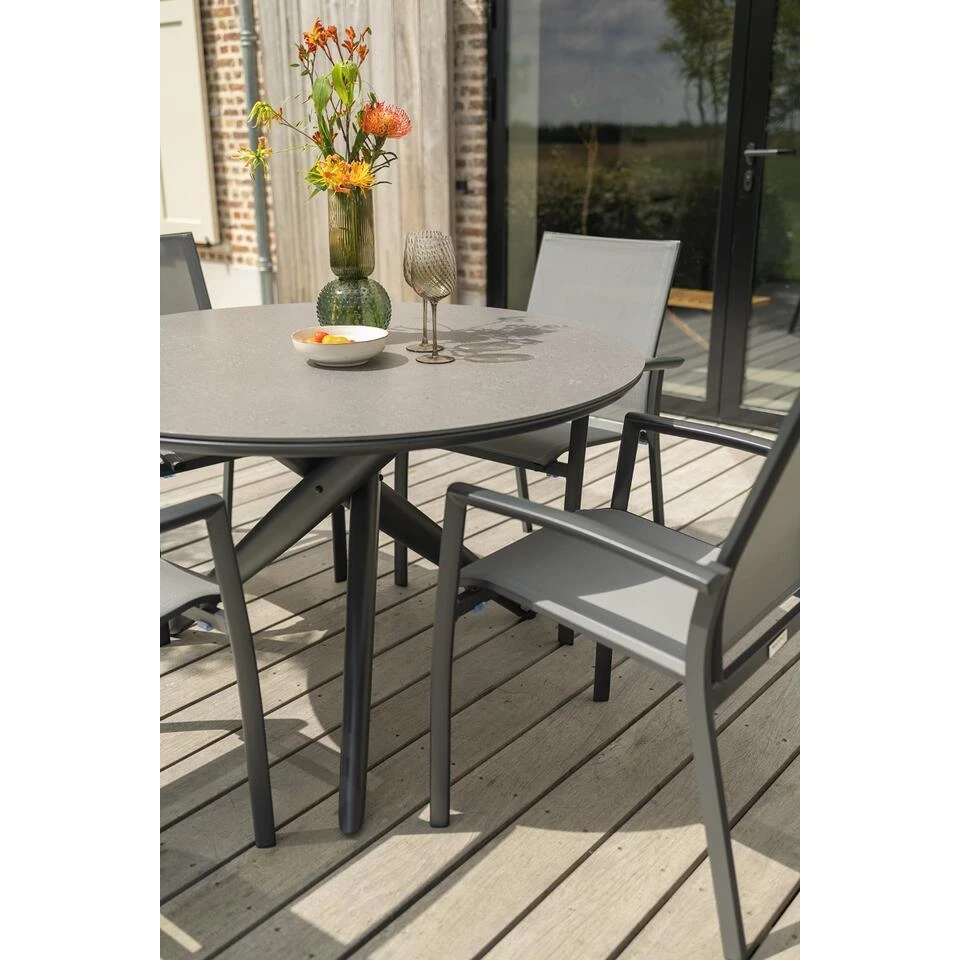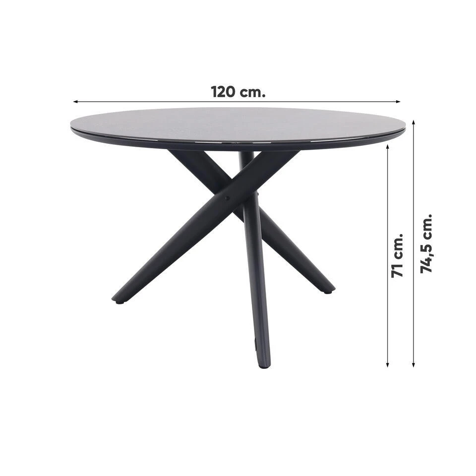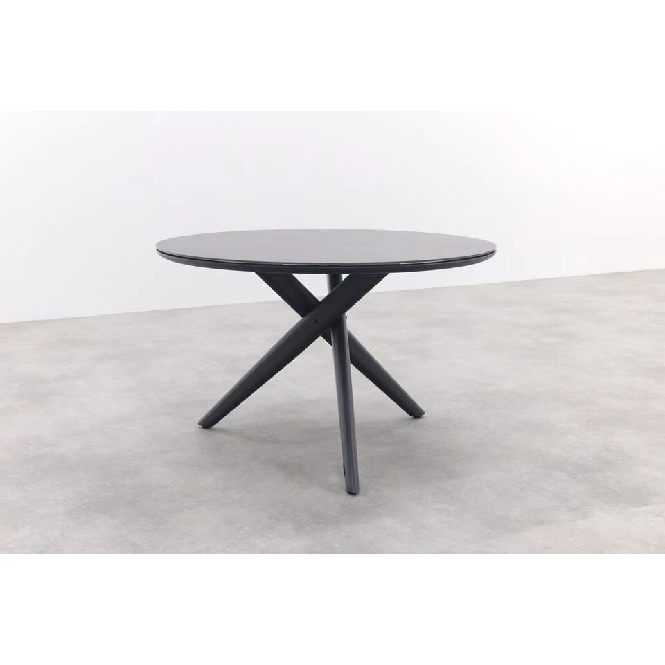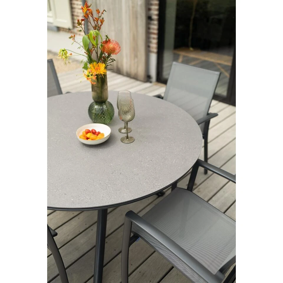 De poten van de Ronde tuintafel Dublin hebben een kruisvorm en zijn gemaakt van aluminium. Dit materiaal is licht van gewicht, stevig en het materiaal kan niet verroesten. Het tafelblad is gemaakt van “Sintered stone” eigenlijk een soort keramiek welke krasvast, hitte bestendig en uv bestendig is. Kortom het ideale materiaal om te verwerken in een tafelblad.