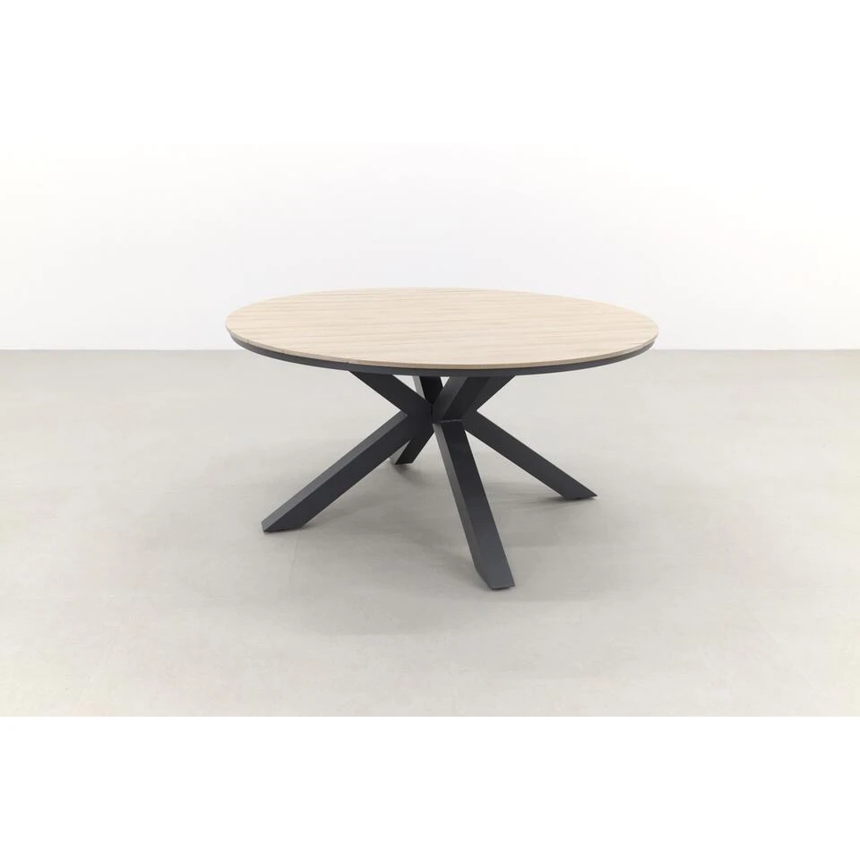 Het unieke kruisonderstel is gemaakt van stevig aluminium en behandeld met een antracietkleurige coating. Deze coating zorgt ervoor dat het frame kras- en stootvast is. Aluminium is een lichtgewicht materiaal dat niet kan verroesten, weinig onderhoud nodig heeft en jarenlang meegaat. Het tafelblad van de Edison tuintafel is gemaakt van polywood latten in een ovale vorm. Polywood is een soort kunststof met de uitstraling van hout. Bij polywood dien je wel rekening te houden met het plaatsen van glaswerk, bloempotten etc.