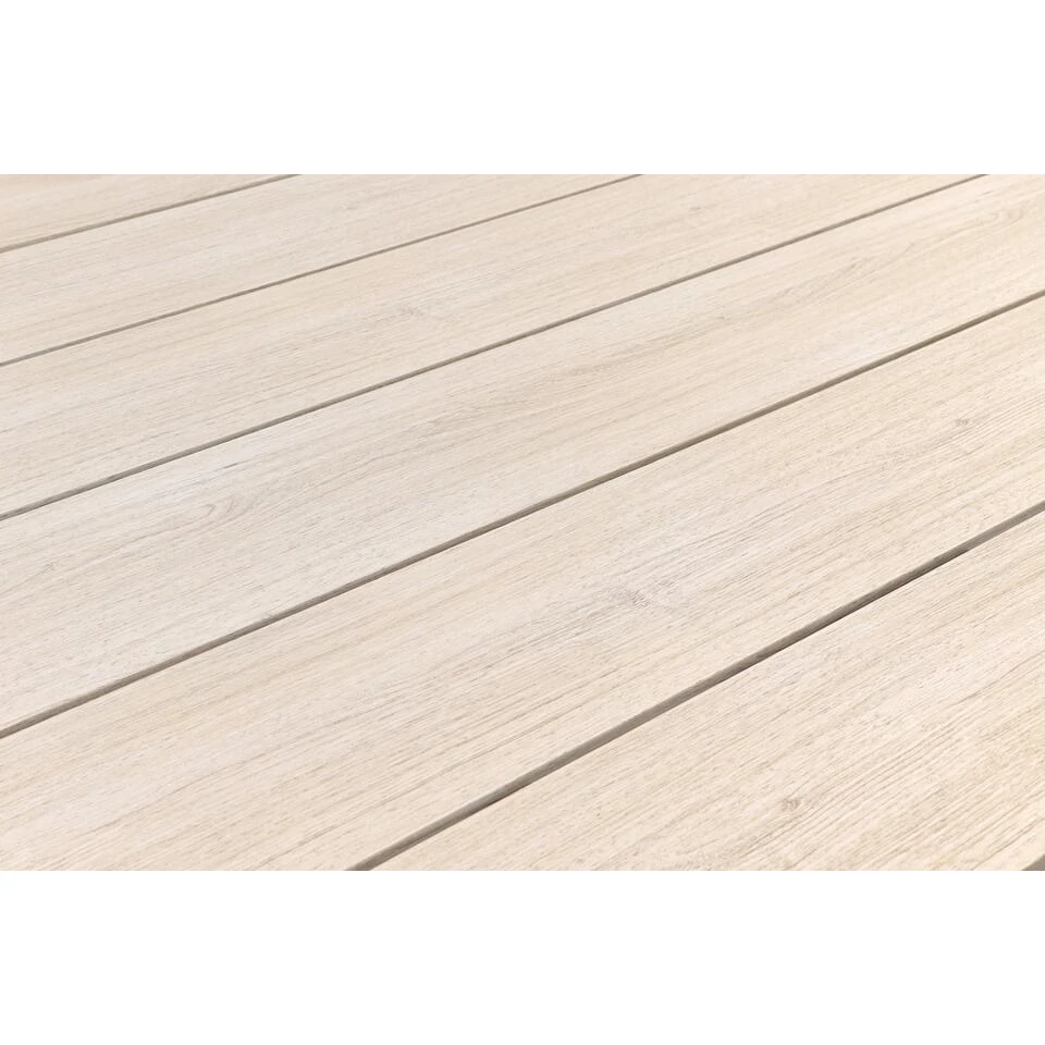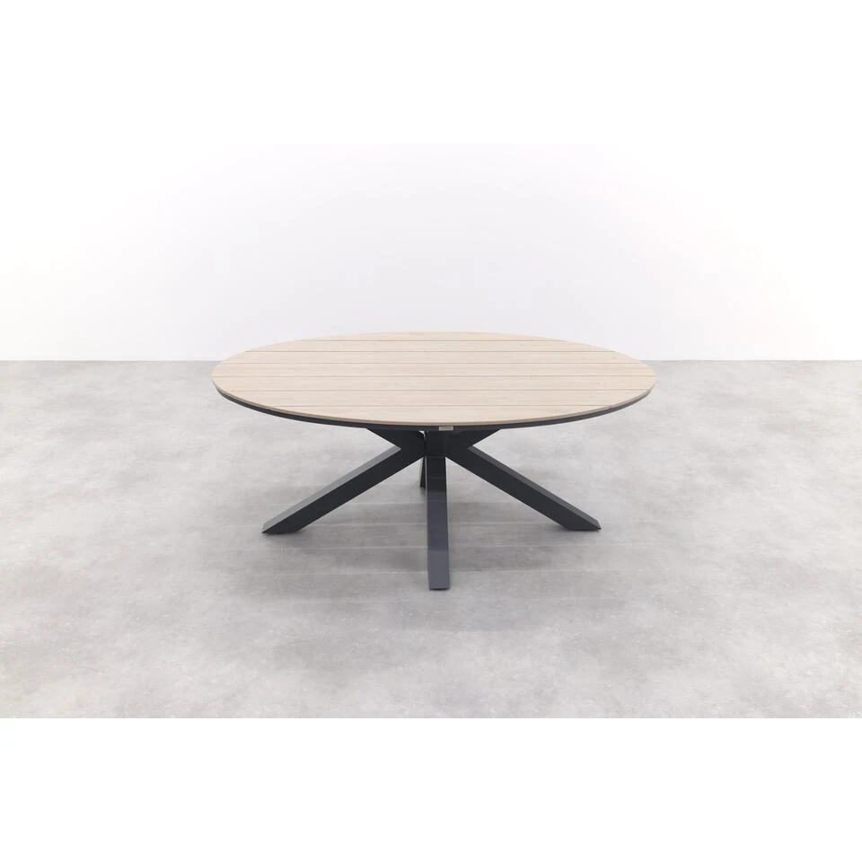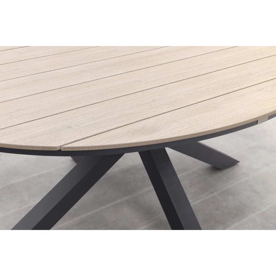 Het unieke kruisonderstel is gemaakt van stevig aluminium en behandeld met een antracietkleurige coating. Deze coating zorgt ervoor dat het frame kras- en stootvast is. Aluminium is een lichtgewicht materiaal dat niet kan verroesten, weinig onderhoud nodig heeft en jarenlang meegaat. Het tafelblad van de Edison tuintafel is gemaakt van polywood latten in een ovale vorm. Polywood is een soort kunststof met de uitstraling van hout. Bij polywood dien je wel rekening te houden met het plaatsen van glaswerk, bloempotten etc. Lees hiervoor het onderhoudsadvies.