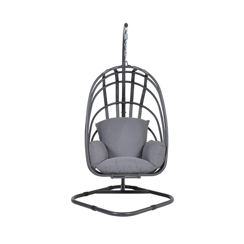 Het hangende ei is vervaardigd uit een onderhoudsvrij aluminium frame in een donker grijze kleur. De hangstoel dient bevestigd te worden aan het meegeleverde stevige stalen frame voor voldoende stabiliteit.