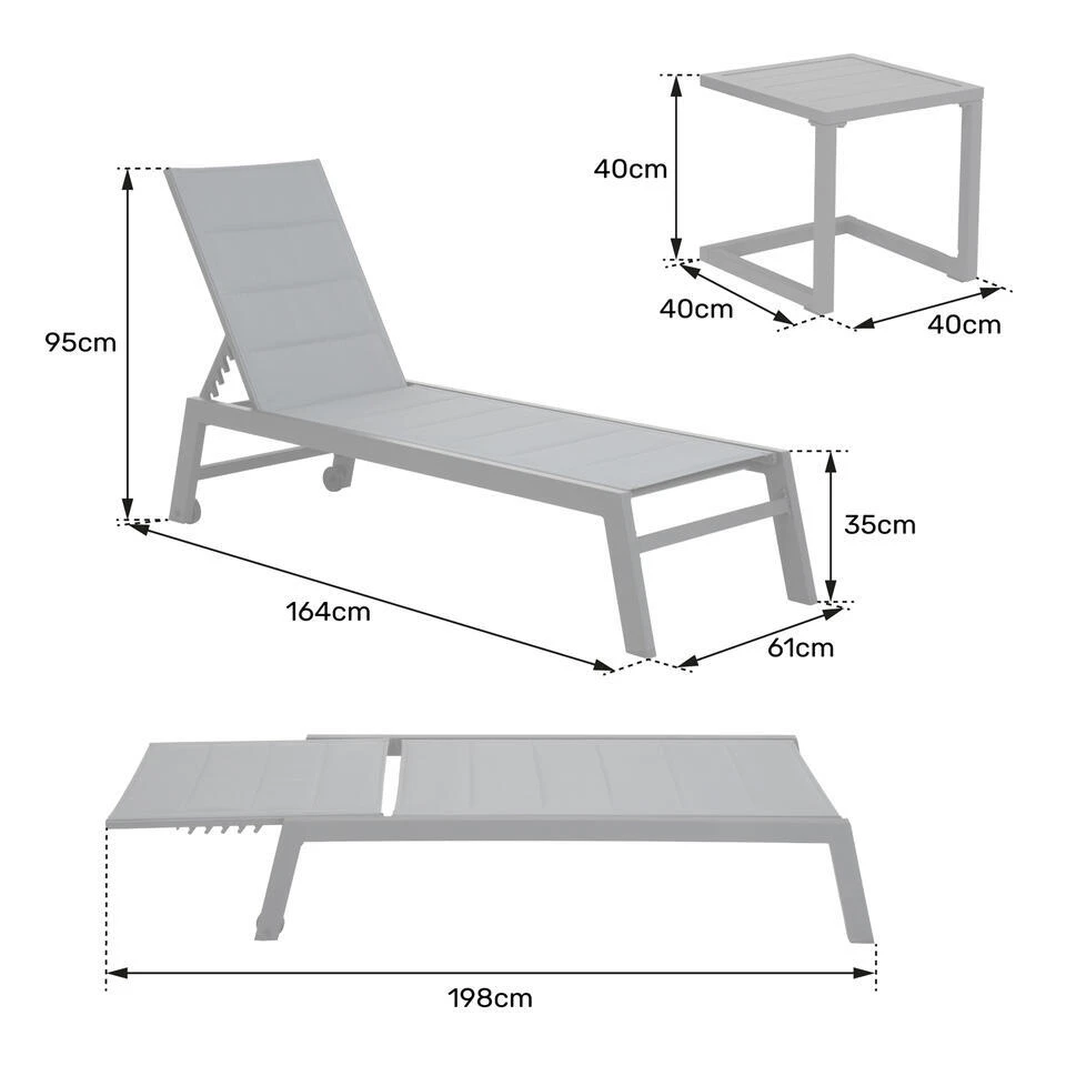 – Ligstoel: L 164 tot 198 × B 61 × H 35 tot 95cm