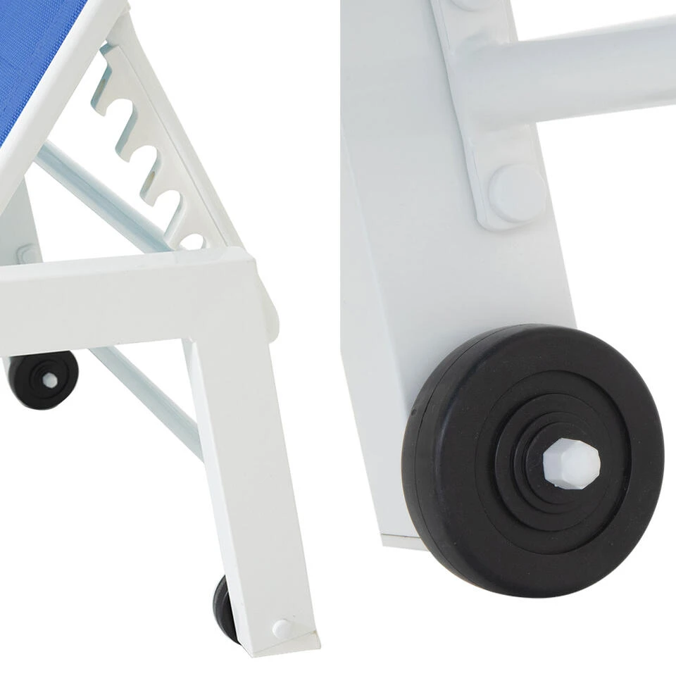 Er wordt gezegd dat geluk alleen de moeite waard is als het gedeeld wordt. Daarom bieden wij u deze set van twee zonnebanken uit de BARBADOS-reeks aan. Ze zijn perfect voor al uw momenten van ontspanning in de zon in uw tuin of gewoon op uw terras in de schaduw van een parasol. De rugleuning is verstelbaar op 5 niveaus. De rugleuning, verstelbaar op 5 niveaus, kan in de gewenste hoek worden gekanteld, zodat u tijdens uw middagpauze in de zomer de ideale positie kunt vinden. Elk ligbed is gemaakt van wit aluminium, dat bestand is tegen buitenomstandigheden, vochtigheid en UV-stralen, en blauw textilene voor de bekleding.