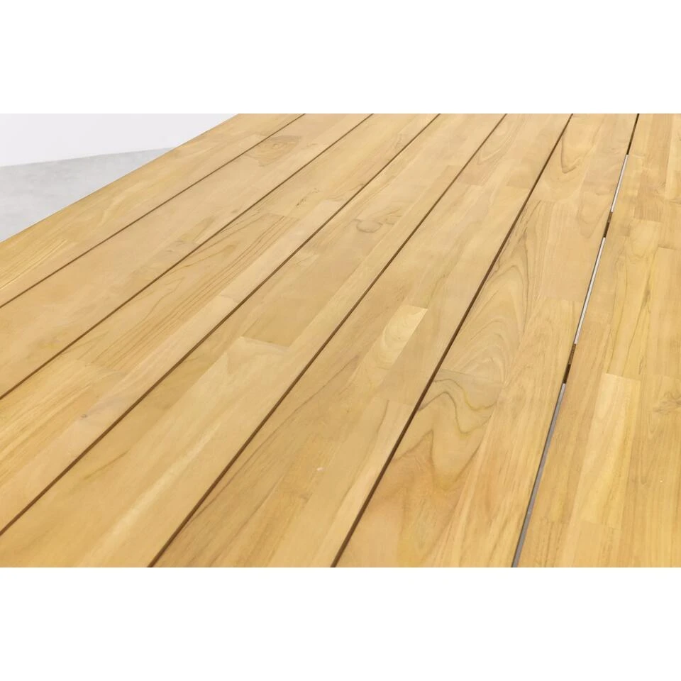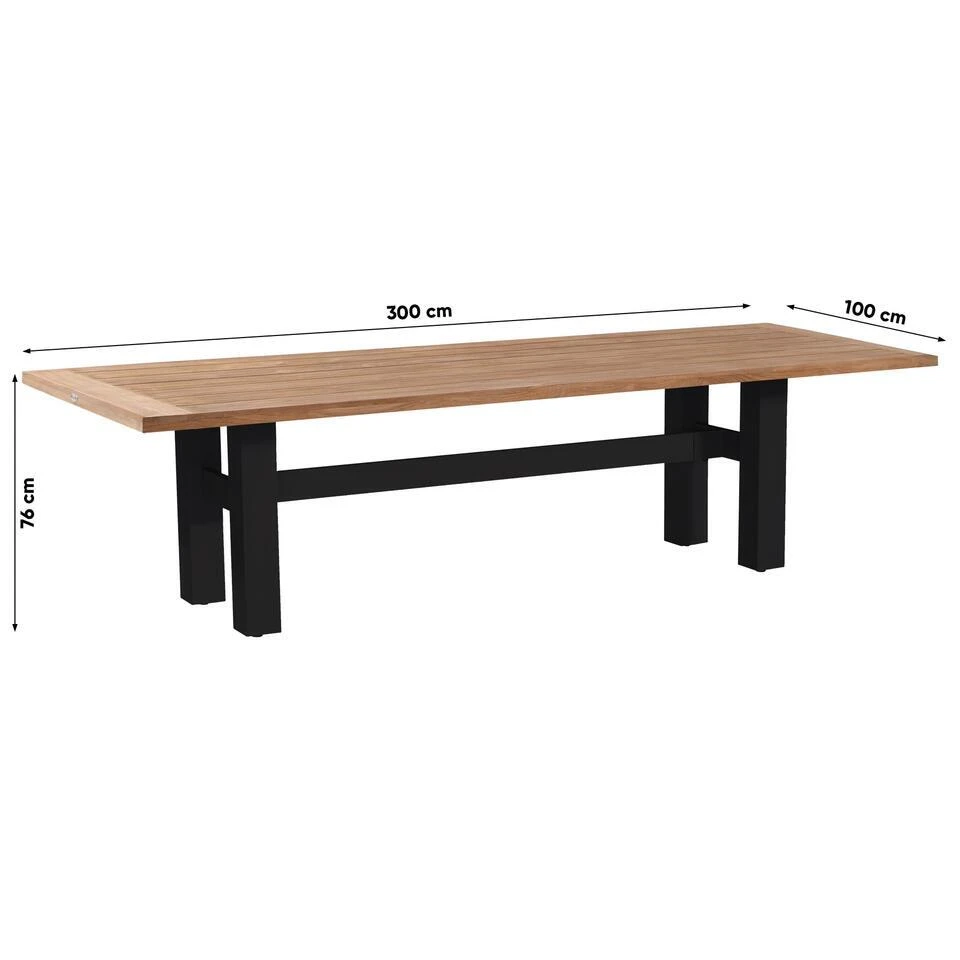 Wat betreft de eigenschappen en materialen is de Yasmani tuintafel ontworpen met duurzaamheid en stijl in gedachten. Het teakhouten tafelblad is niet alleen mooi om te zien, maar ook bestand tegen de weersinvloeden. Teakhout is van nature weersbestendig en hierdoor uitermate geschikt voor buiten gebruik. Houdt er rekening mee dat het tafelblad nog zal verkleuren, het zal een grijzere kleur krijgen. Dit proces kan je vertragen door een teakprotector te gebruiken. Het zwarte aluminium frame biedt niet alleen stevigheid het is ook roestbestendig. Hierdoor zal de Yasmani tuintafel zijn prachtige uitstraling nog jarenlang behouden.