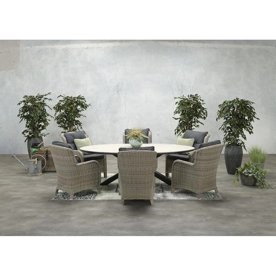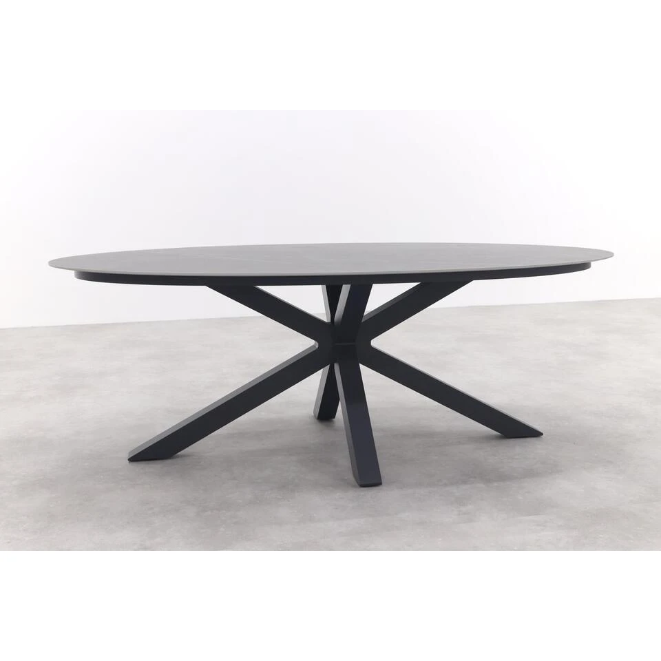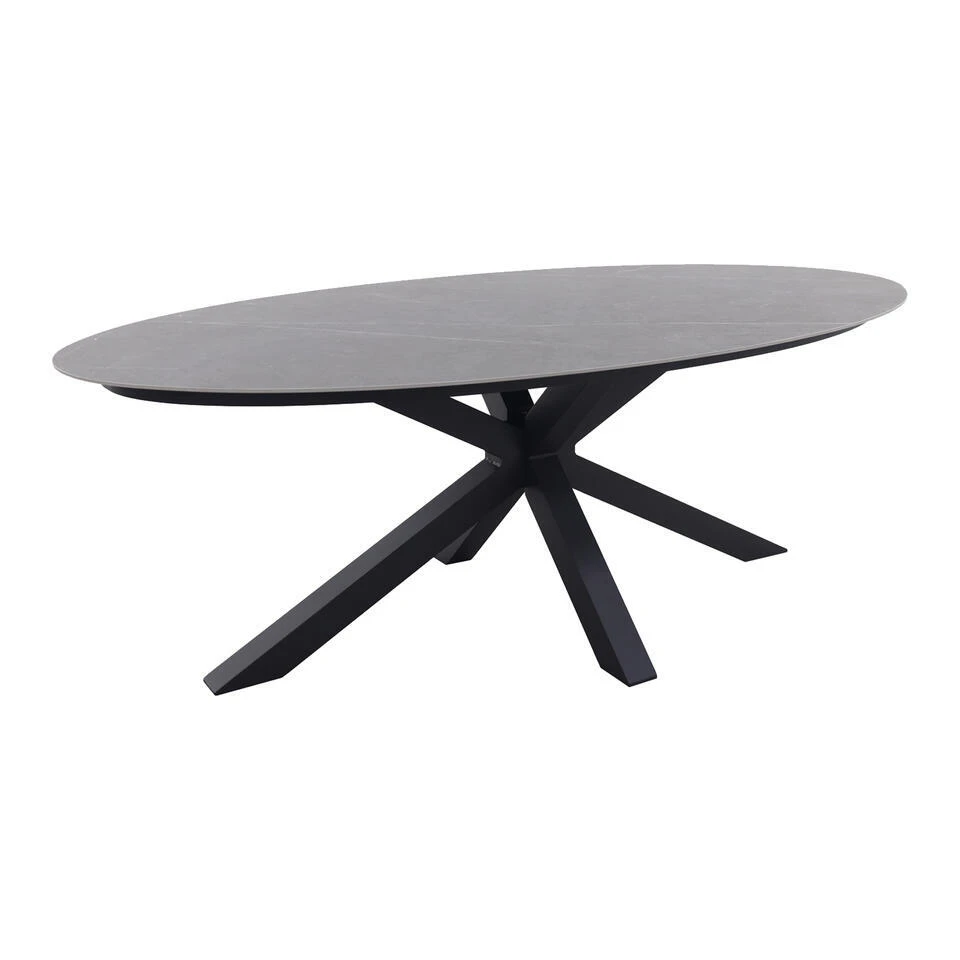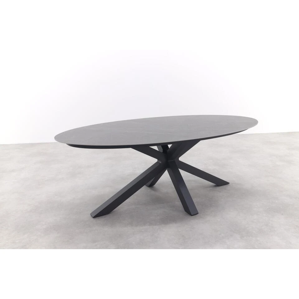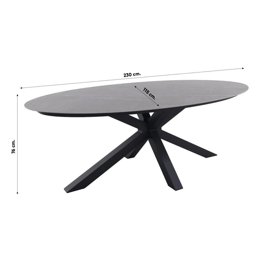 De Scotland ovale tuintafel Centostone met een marmerlook in het antraciet is een échte eyecatcher. Door zijn ovale vorm en donkere marmerlook blad is deze tuintafel helemaal volgens de laatste trends en een echte must-have. De ovale vorm zrogt voor een ruime tafel waar je met 6 personen buiten van elkaars gezelschap geniet. Dankzij het donkere blad met marmerlook voeg je eenvoudig een vleuge luxe en elegantie toe aan jouw tuin. De Scotland ovale tuintafel is gemakkelijk te combineren met andere materialen tuinmeubelen. De ovale tuintafel is vervaardigd uit unieke en onderhoudsvriendelijke materialen. Zo geniet jij zorgeloos van het buitenleven.