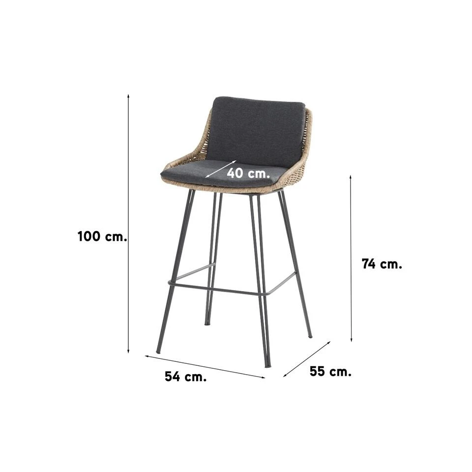 Het frame van de Bohemian barstoel is gemaakt van RVS. Waardoor de levensduur extra lang is. RVS kan namelijk niet gaan roesten en is zeer stevig. Het frame is voorzien van dwarsliggers, waardoor daar uw voeten op kunnen rusten. Op het frame is de zitting bevestigd. De zitting is gemaakt van het materiaal Wicker. De barstoel heeft weinig onderhoud nodig. We raden aan om het kussen droog en geventileerd op de bergen als u de stoel niet gebruikt.