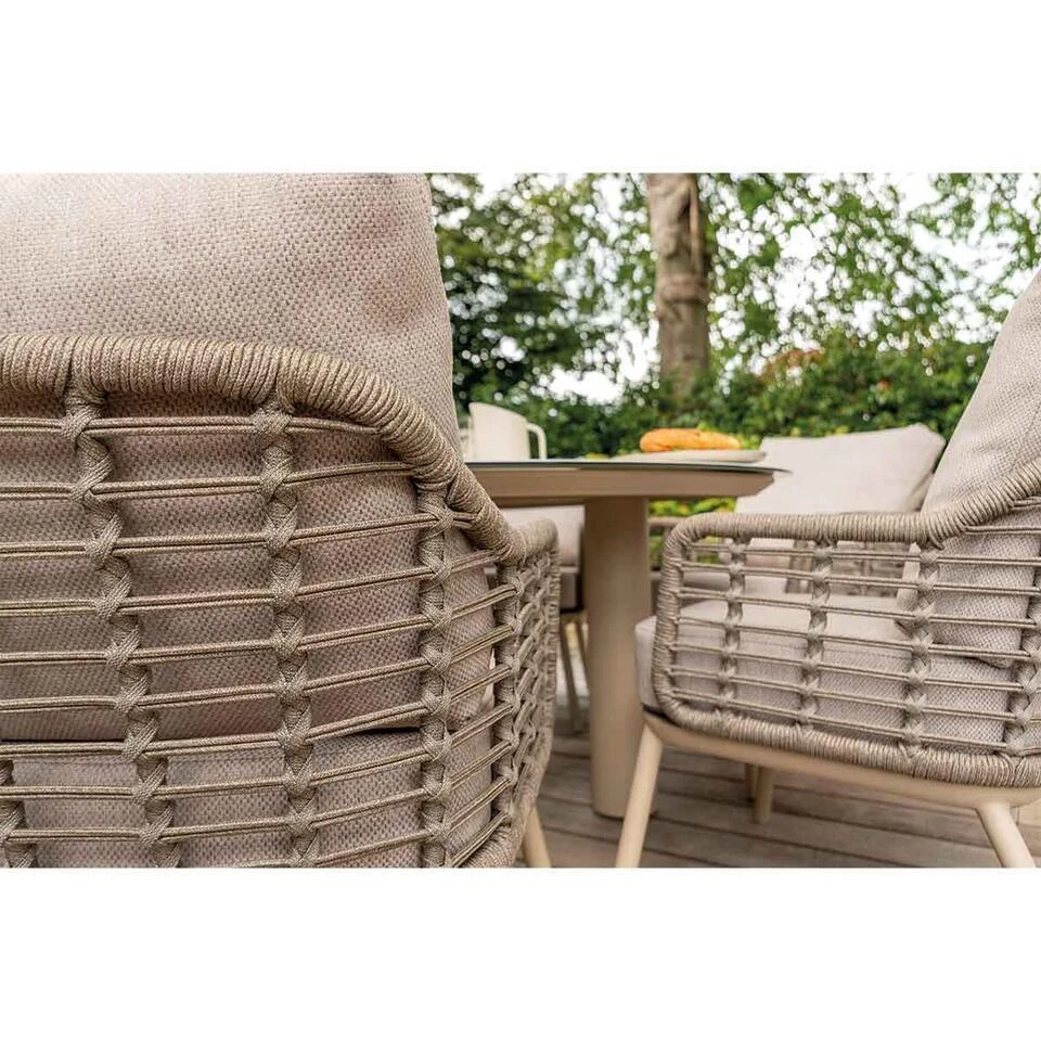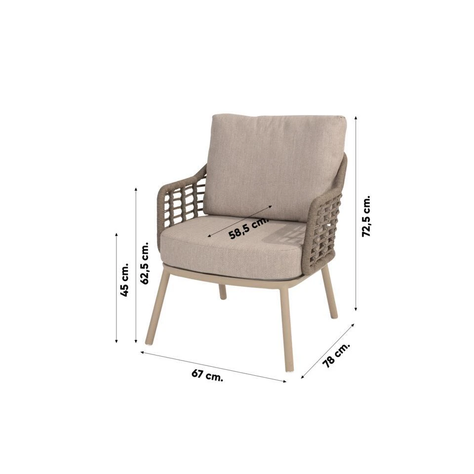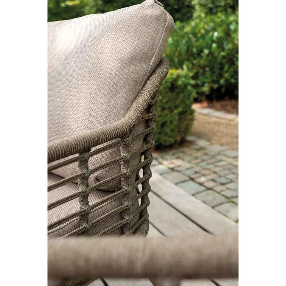 Het sterke frame van de Puglia tuinstoel is gemaakt van aluminium met een latte kleurige poedercoating. Daar omheen zit rope wat speciaal is ontworpen voor buitengebruik. Rope heeft een buitenlaag van Olefin en de binnenlaag is gemaakt van polypropyleen.