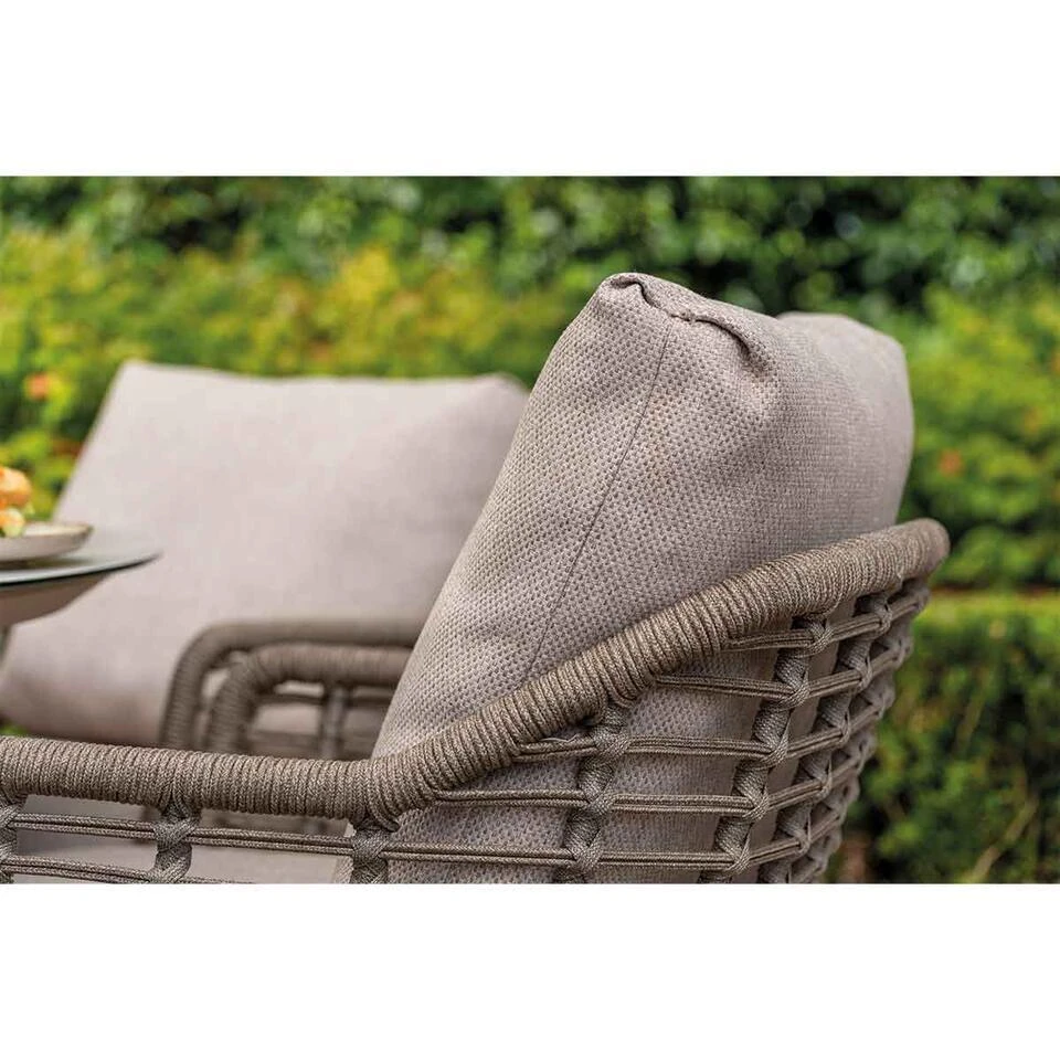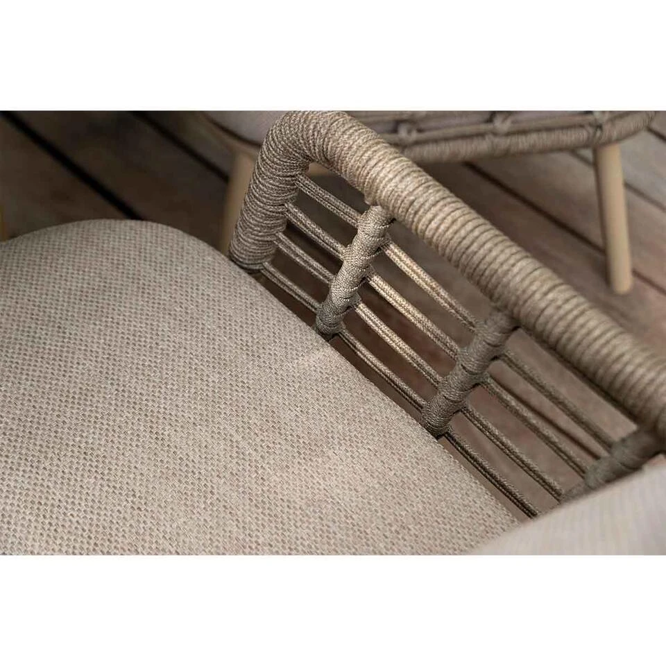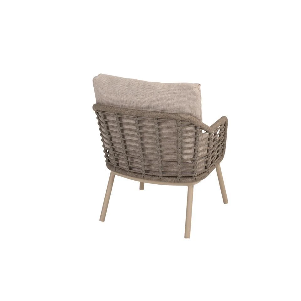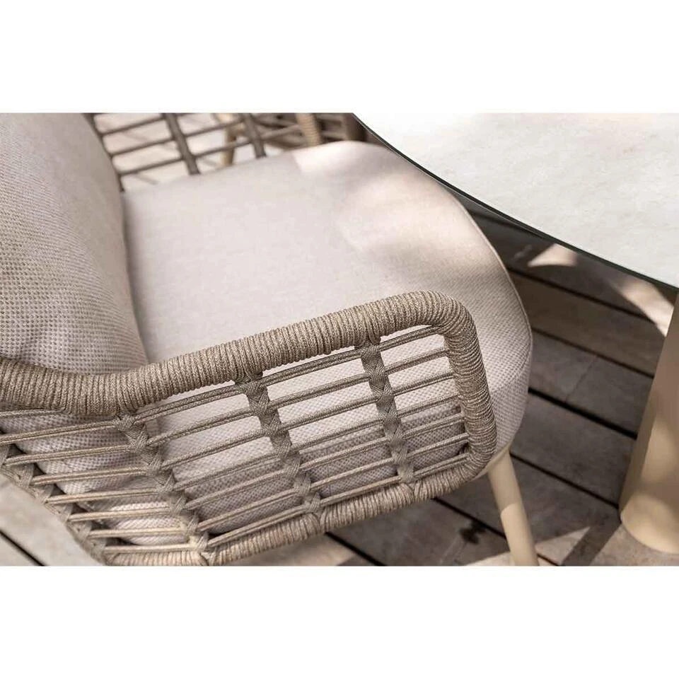 Het sterke frame van de Puglia tuinstoel is gemaakt van aluminium met een latte kleurige poedercoating. Daar omheen zit rope wat speciaal is ontworpen voor buitengebruik. Rope heeft een buitenlaag van Olefin en de binnenlaag is gemaakt van polypropyleen.