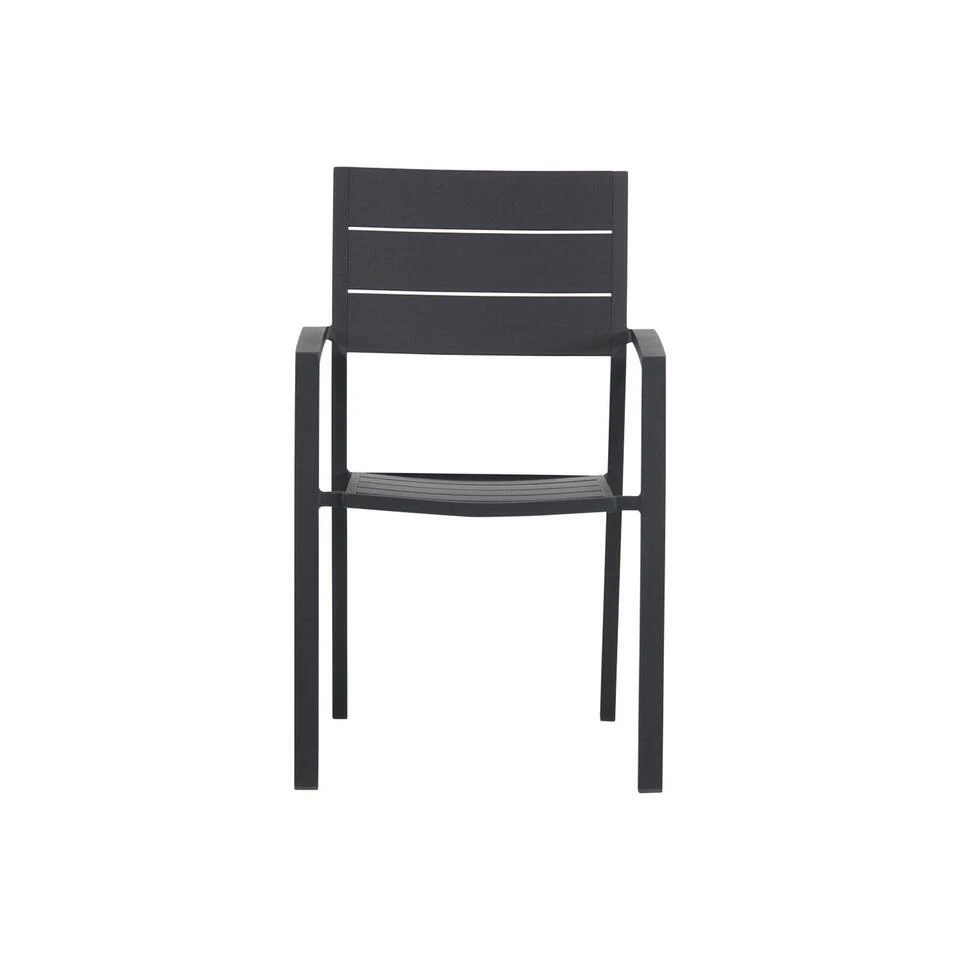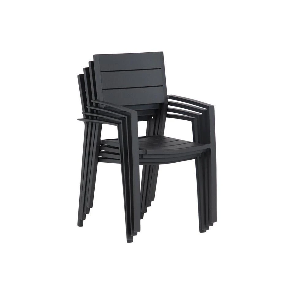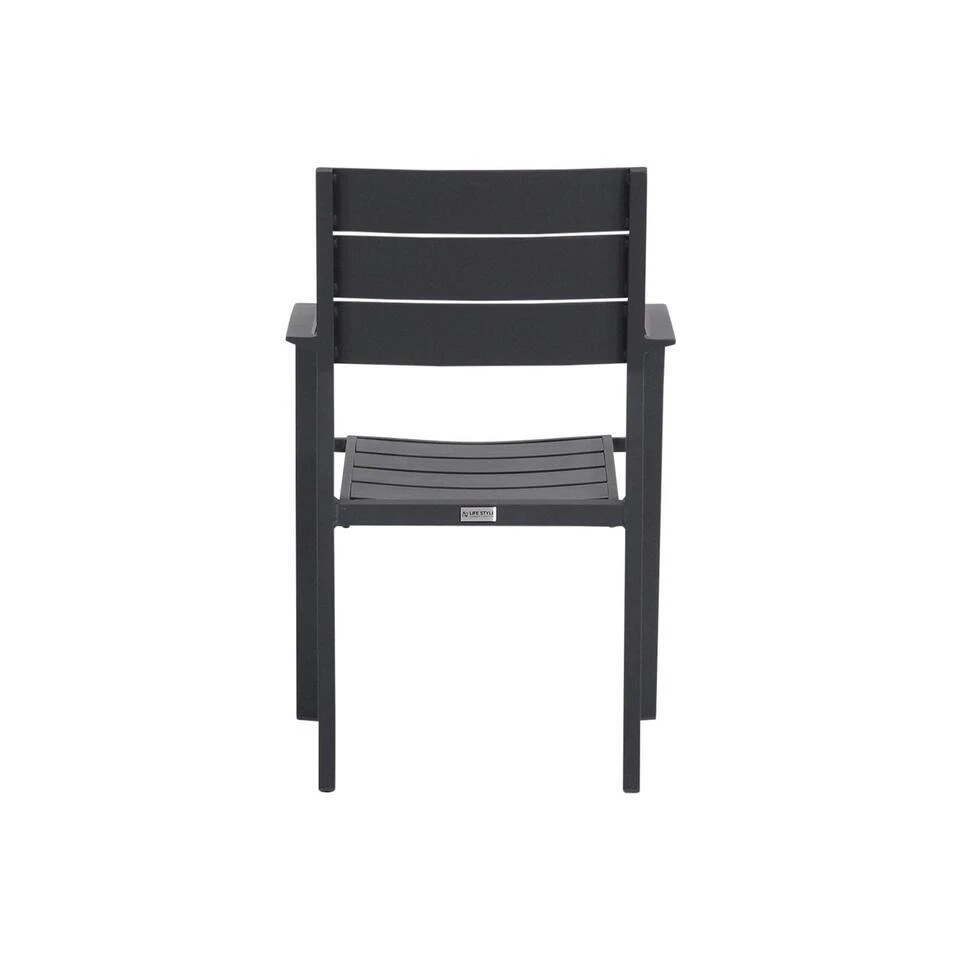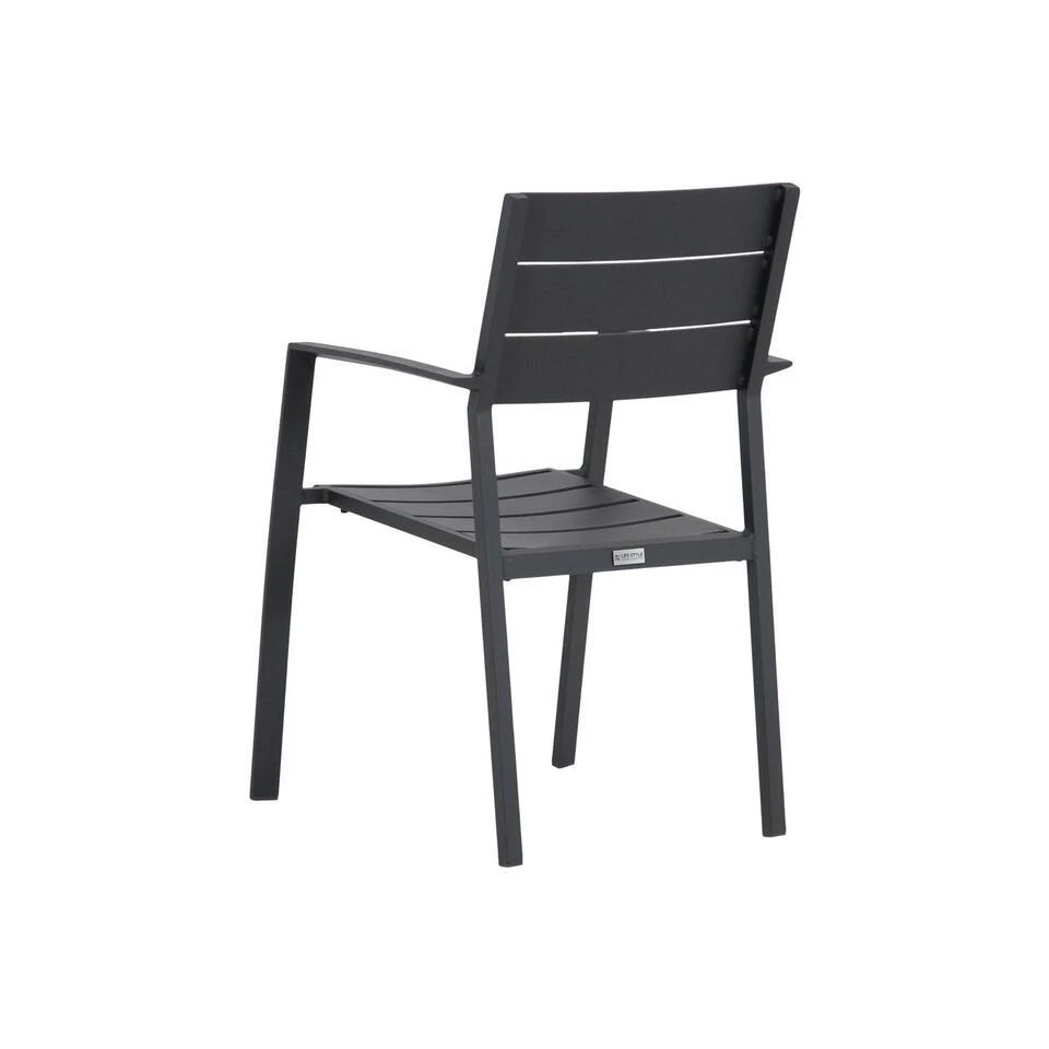 Lifestyle Stella dining tuinstoel De Lifestyle Stella dining tuinstoel is een strak ontworpen moderne tuinstoel met een goed zitcomfort. Dit komt omdat de rugleuning is voorgevormd, zodat er een goede zitverhouding ontstaat. De antraciet kleurige tuinstoel heeft een stijlvolle en tijdloze uitstraling. De Stella dining tuinstoel is makkelijk stapelbaar. Je kunt de Stella tuinstoel uitstekend combineren met de vele tuintafels uit de collectie van Tuinmeubelshop. Eigenschappen Lifestyle Stella dining tuinstoel De Lifestyle dining tuinstoel is volledig gemaakt uit hoogwaardig aluminium. Dit materiaal heeft als voordelen dat het sterk, licht van gewicht en onderhoudsvrij is. Bovendien is de tuinstoel voorzien van een duurzame poedercoating, wat extra sterke beschermlaag vormt. De Lifestyle Stella dining tuinstoel kan het hele jaar door buiten blijven staan, en is eenvoudig te reinigen met een mild sopje.
