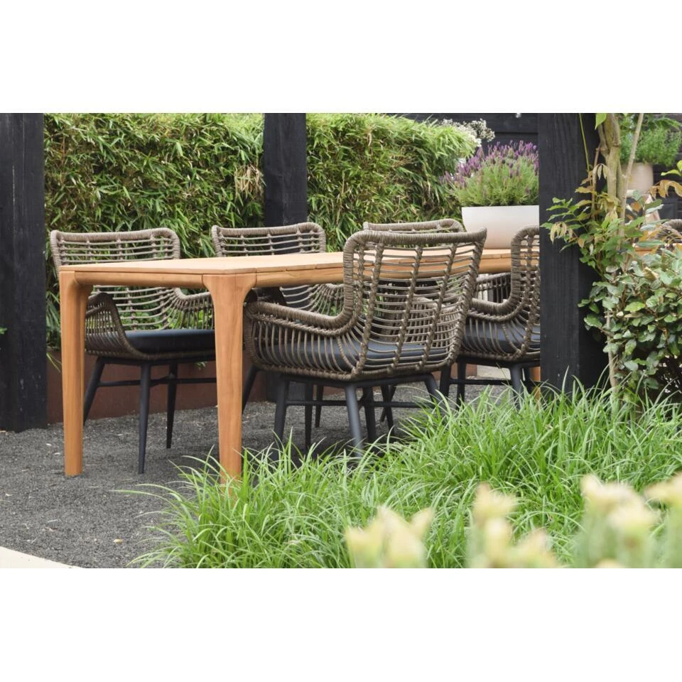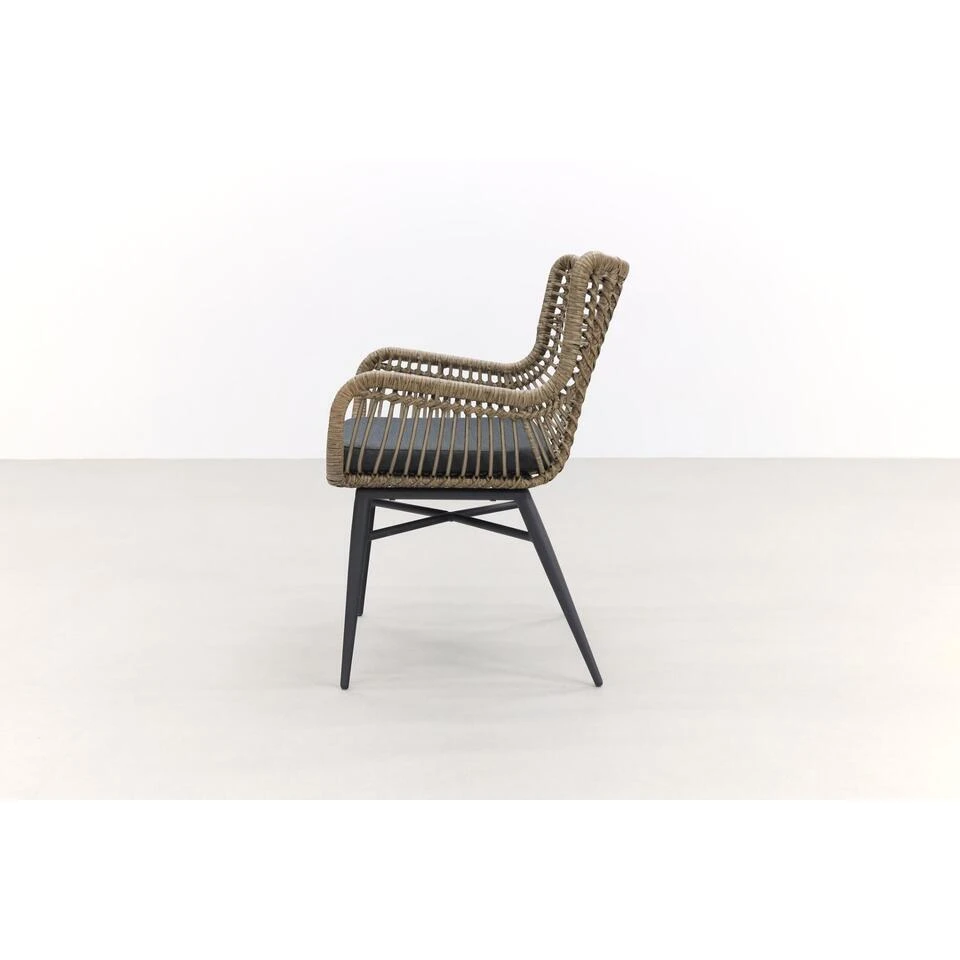 Het frame van de Jasmine dining tuinstoel is gemaakt van aluminium. Aluminium is licht van gewicht en onderhoudsvriendelijk. Het frame heeft een antraciet kleurige coating welke kras- en stootvast is. Om het frame is het kunststof wicker gevlochten. Het wicker is uitgevoerd in een bruine kleur en combineert dus erg goed bij het frame.